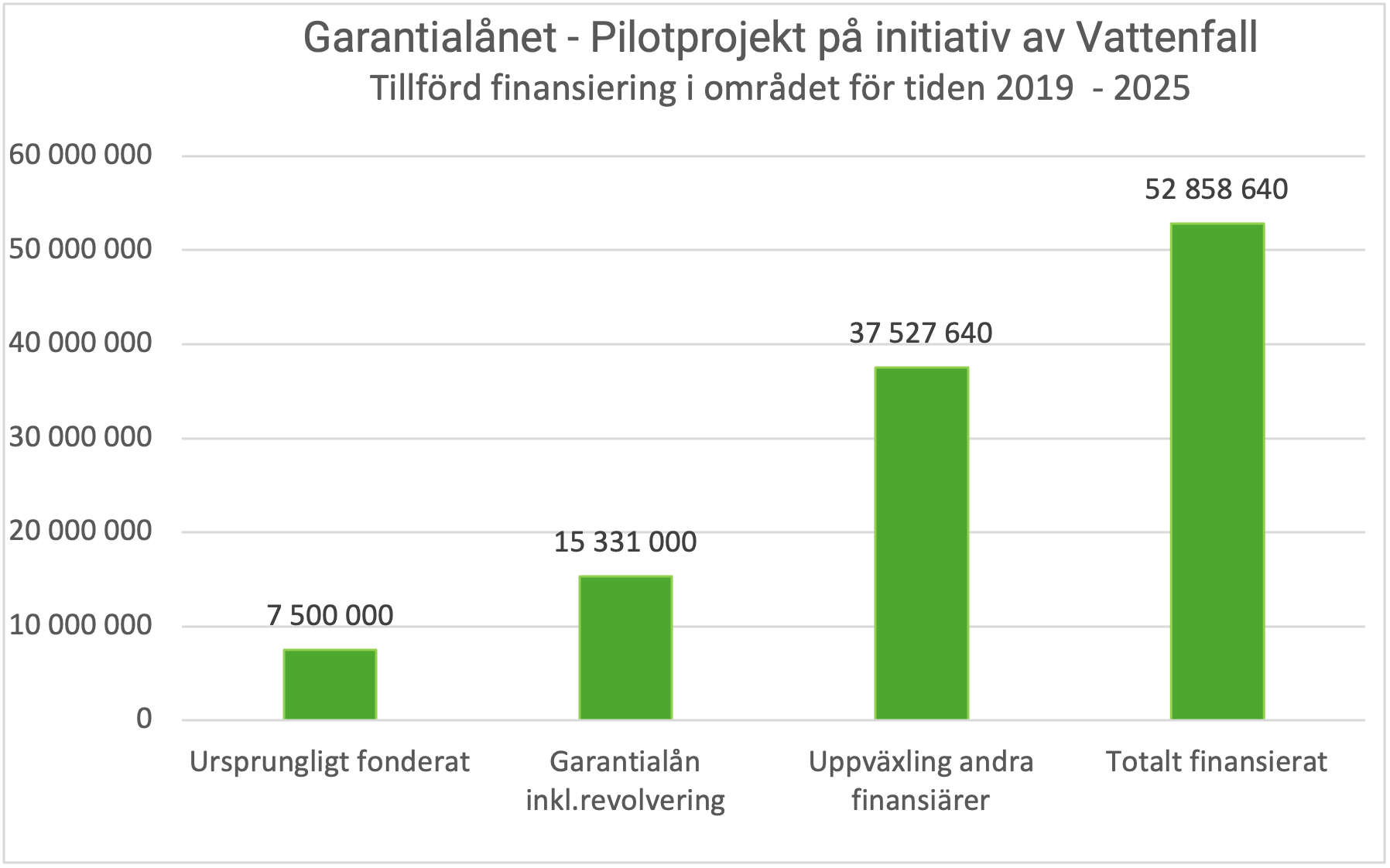 På initiativ av Vattenfall driver Garantia sedan sommaren 2019 ett pilotprojekt som innebär att en andel av vindparken Blakliden Fäbodbergets (i Åsele och Lycksele kommuner) intäkter avsatts till en fond för kreditgivning till företag inom vindparkens arbetsmarknadsområde. Nedan visar utfallet av kreditgivningen från starten 2019 till och med 2025. Revolvering och uppväxling har hittills inneburit att drygt sju gånger det ursprungliga kapitalet har investerats i området.