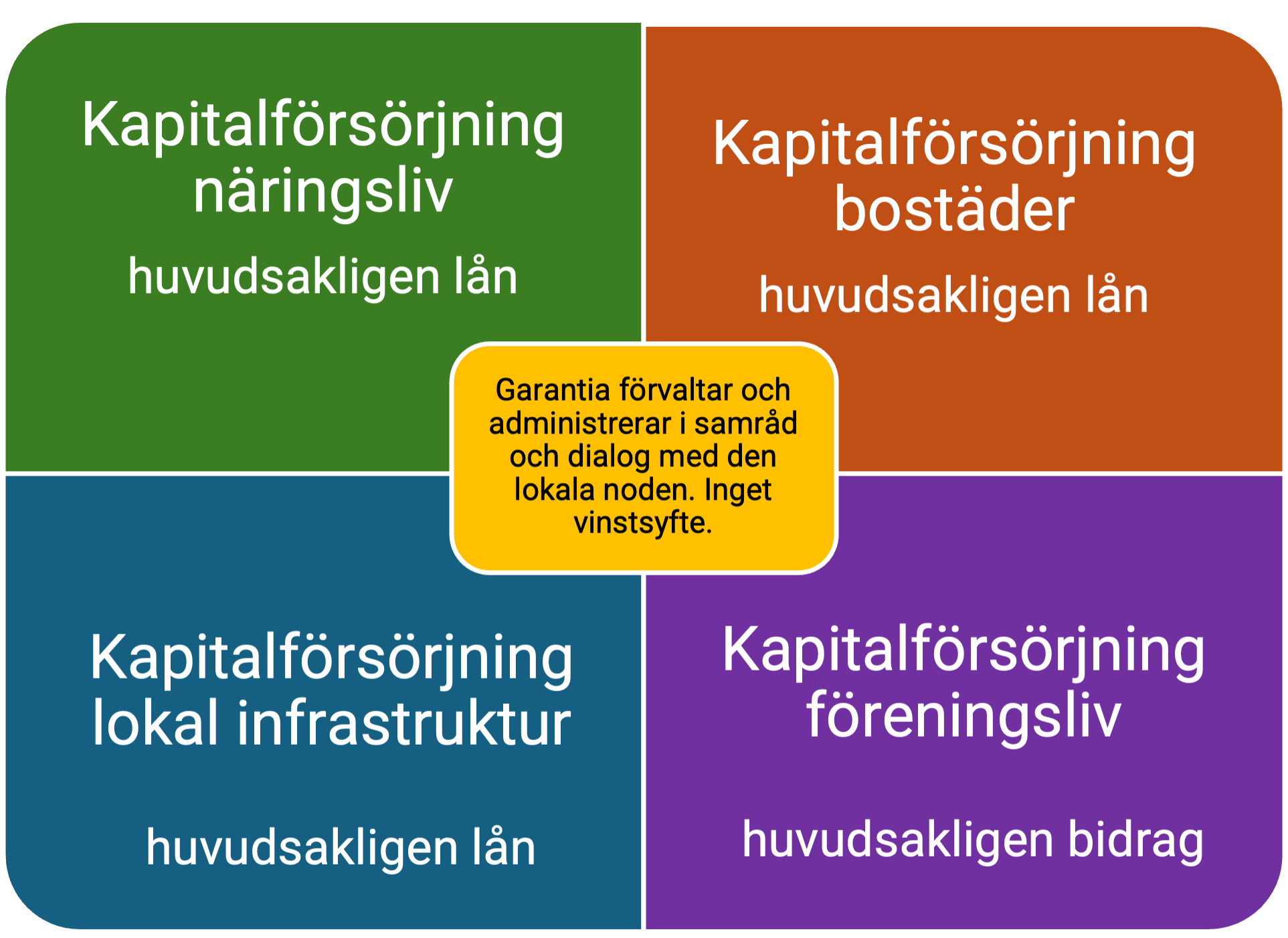 Garantia är mottagare av hela eller del av den avsättning som till exmpel en vindpark gör för utveckling av lokalsamhället. I samråd och i dialog med den lokala noden förvaltar och administrerar Garantia utan vinstsyfte de erhållna medlem. Garantias uppdrag är att tillsammans med den lokala noden definiera de lokala behoven. Dessa varierar sannolikt såväl mellan kommuner som över tid. Genom att arbeta med fyra- till femårscykler anpassas användandet av lokala fondmedel till lokala relevanta behov.