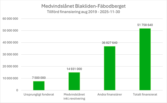 Under det pilotprojekt som bedrivs i samarbete med Blakliden Fäbodberget Vind AB i Åsele och Lycksele kommuner har hittills drygt 51 miljoner kronor investerats utifrån ursprungligt fonderat belopp på 7,5 miljoner kronor.